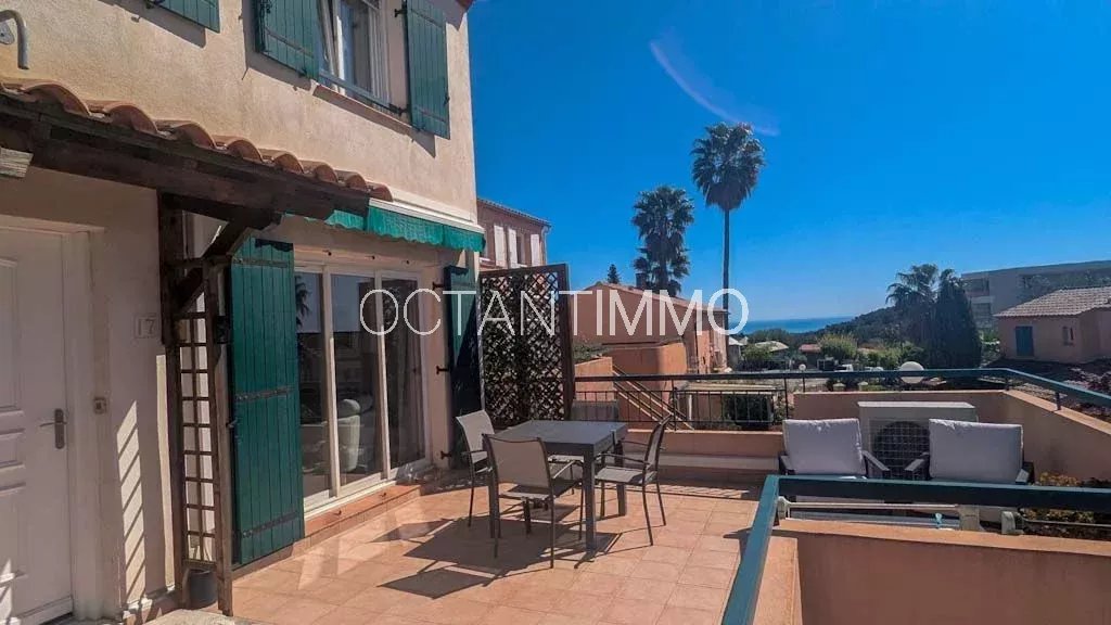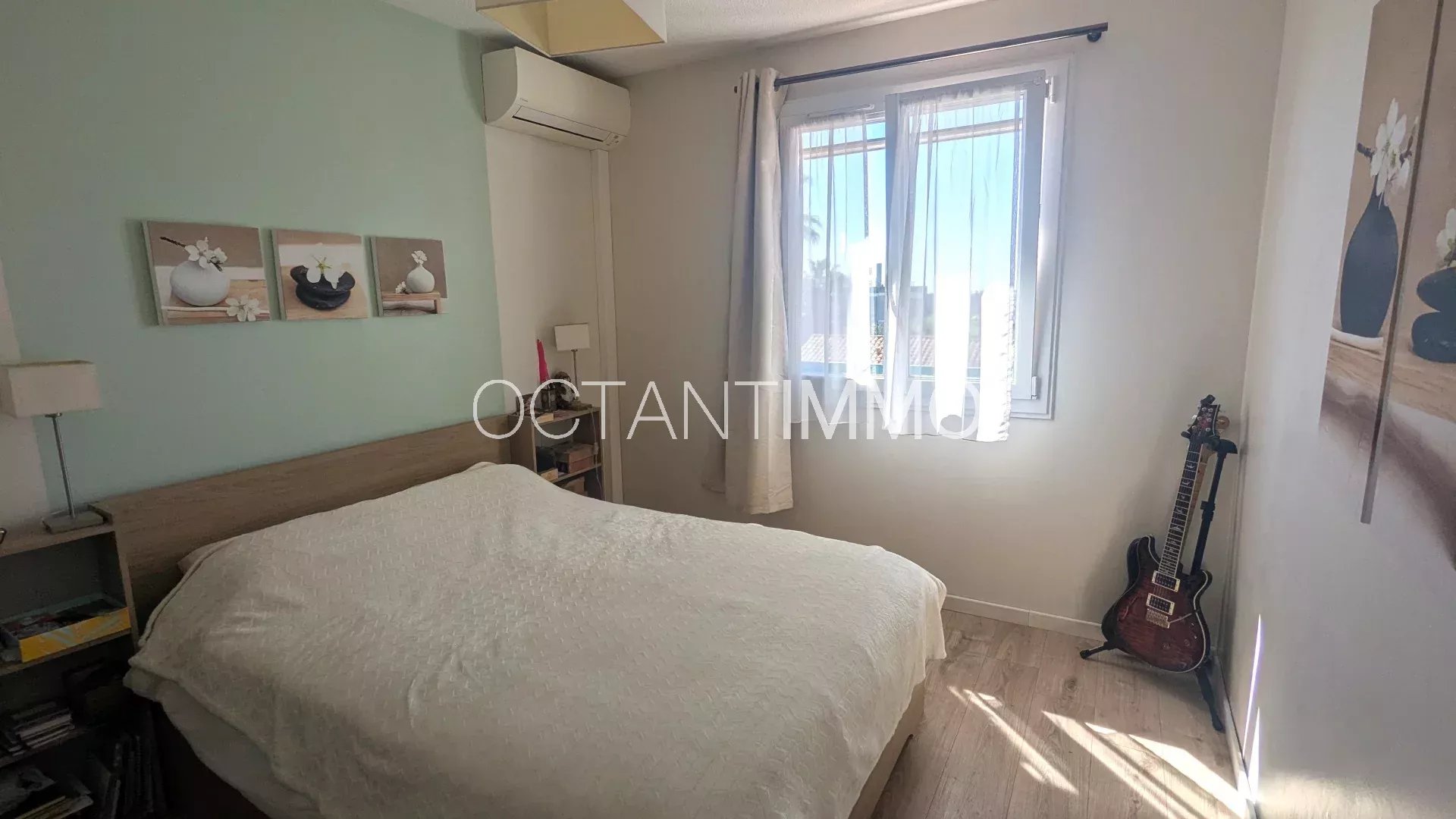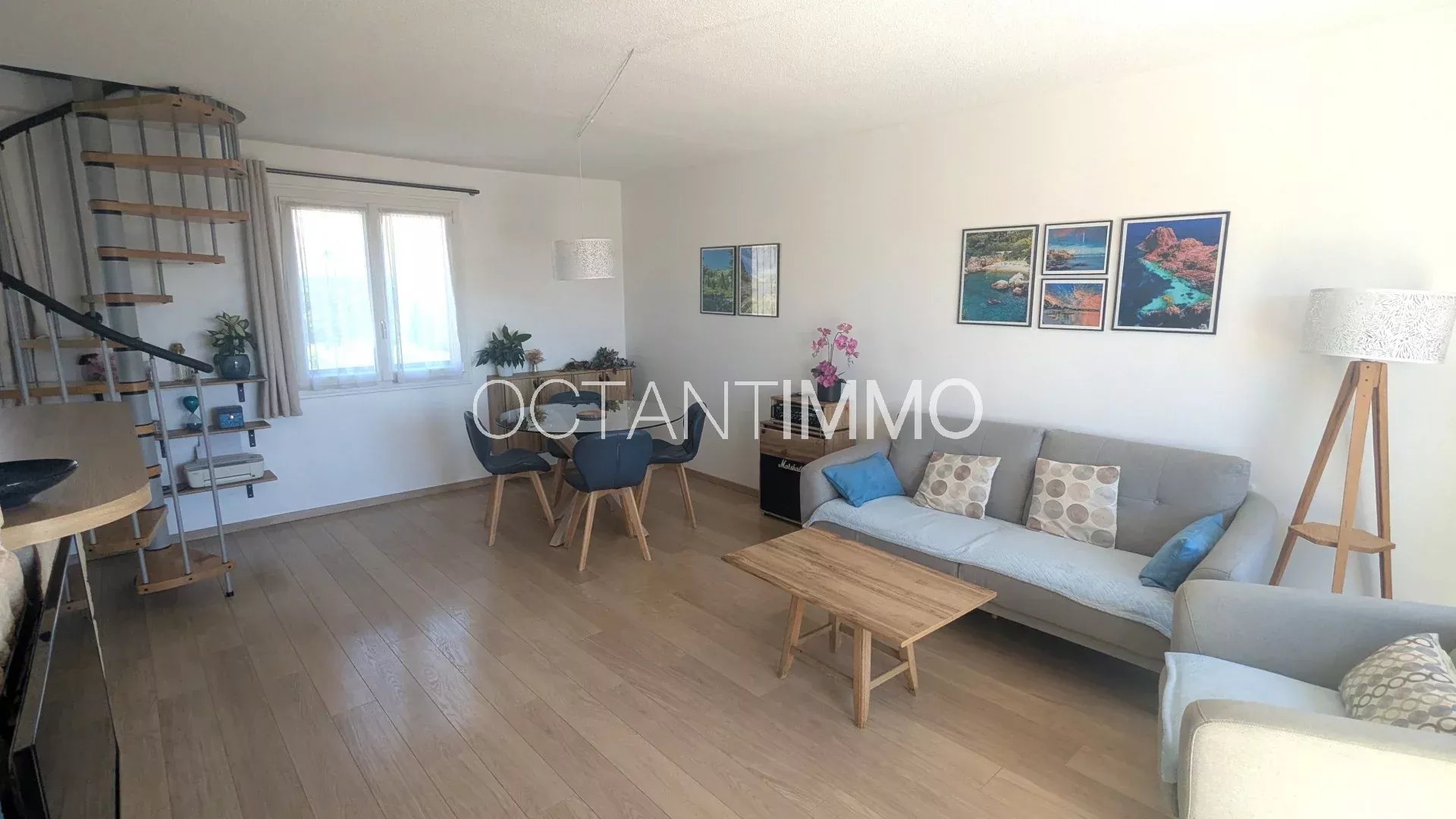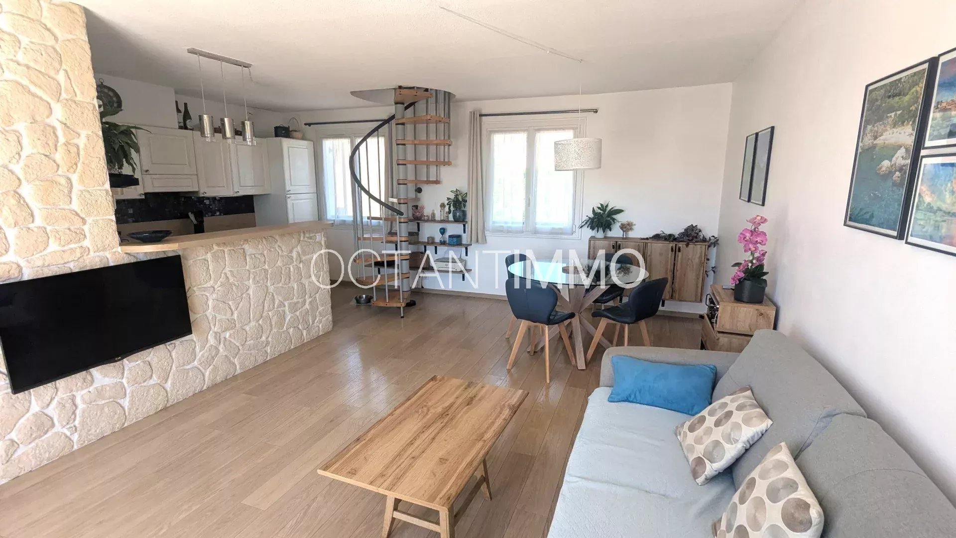 Dans une résidence fermée, au calme, appartement 3p de 65 m² en duplex au premier et dernier étage. Grande terrasse de 25m² exposée sud avec aperçu mer, entrée avec placard et WC invité. Séjour avec cuisine américaine équipée. A l'étage: 2 chambres dont une avec placard, 1 salle de bain avec WC, et un bureau avec dressing. Climatisation dans le séjour et les chambres. Garage fermé. Faibles charges. A pieds des écoles, commerces et bus. Copropriété de 41 lots principaux. Charges mensuelles d’environ 29 €. Pas de procédure en cours. Honoraires d’agence à la charge des vendeurs.