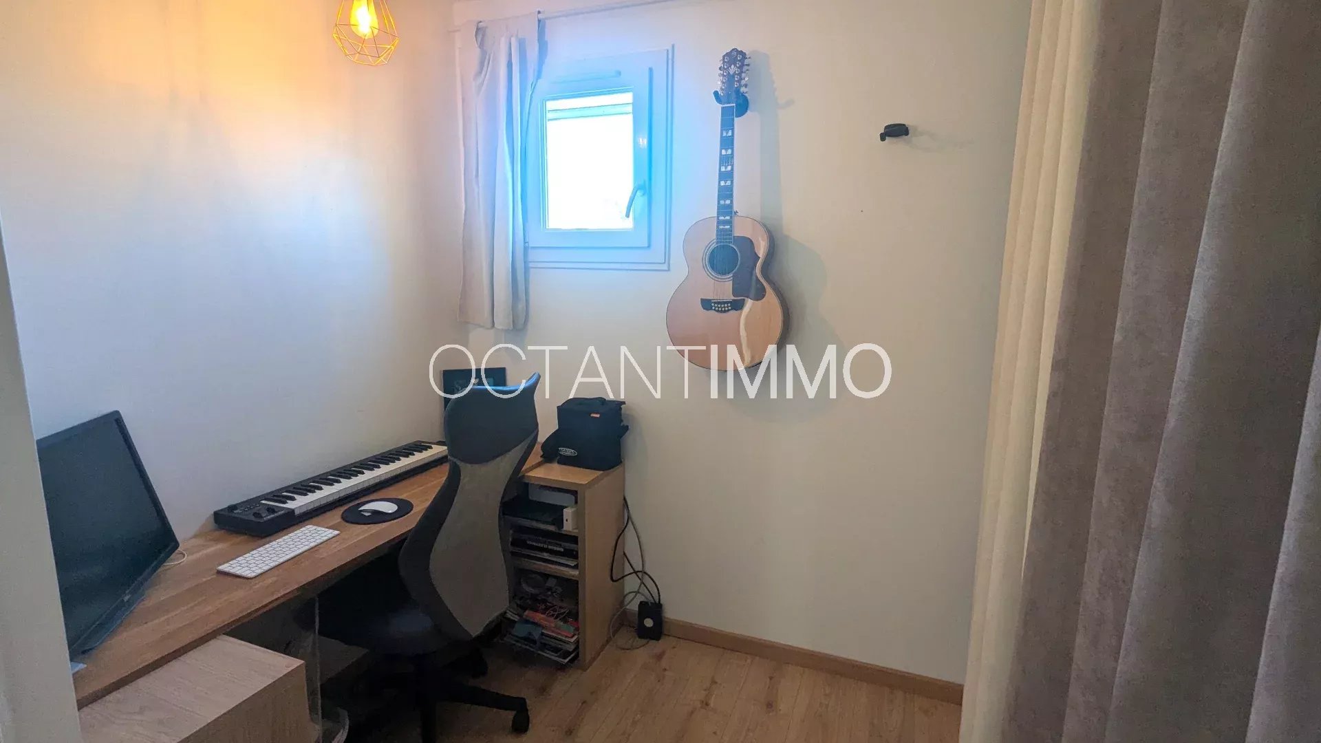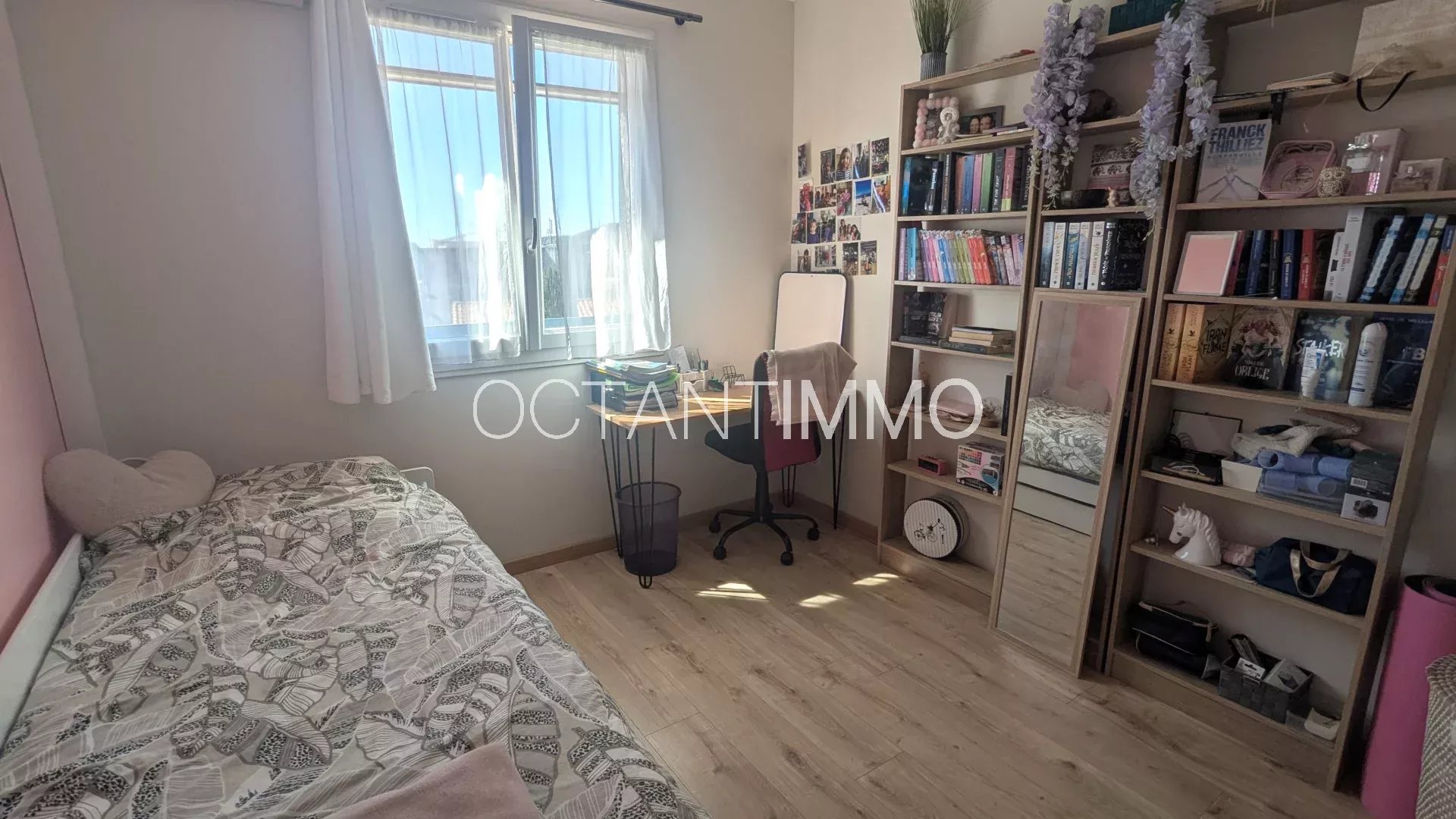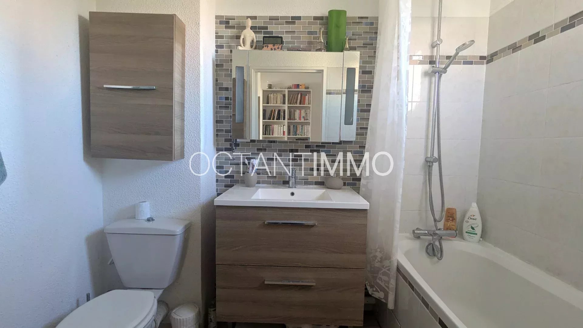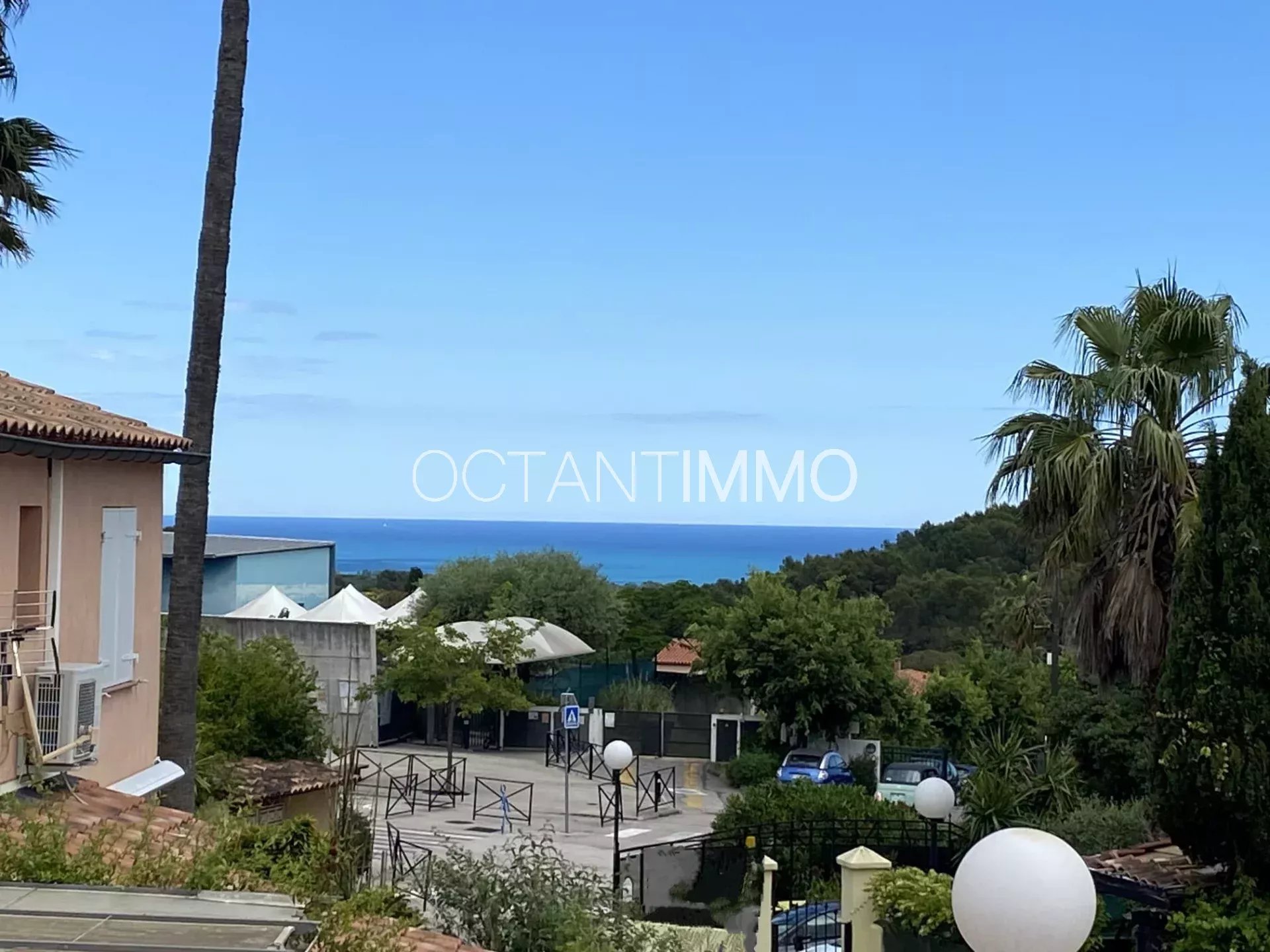 Dans une résidence fermée, au calme, appartement 3p de 65 m² en duplex au premier et dernier étage. Grande terrasse de 25m² exposée sud avec aperçu mer, entrée avec placard et WC invité. Séjour avec cuisine américaine équipée. A l'étage: 2 chambres dont une avec placard, 1 salle de bain avec WC, et un bureau avec dressing. Climatisation dans le séjour et les chambres. Garage fermé. Faibles charges. A pieds des écoles, commerces et bus. Copropriété de 41 lots principaux. Charges mensuelles d’environ 29 €. Pas de procédure en cours. Honoraires d’agence à la charge des vendeurs.